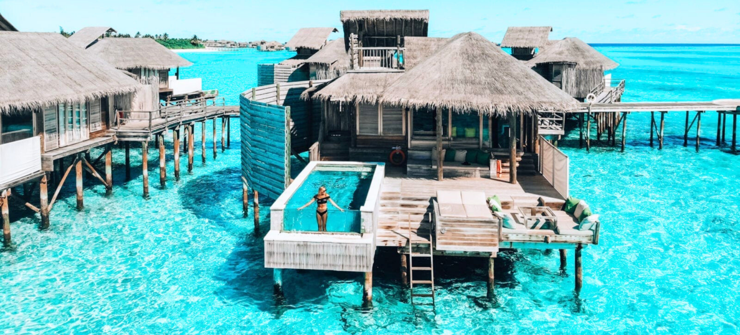 *Villa Pilotis Océan (108m²) : Les Villas pilotis océan disposent d’une vue impressionnante sur l’océan et d’une baignoire en verre pour observer les poissons dans le lagon tout en prenant votre bain.